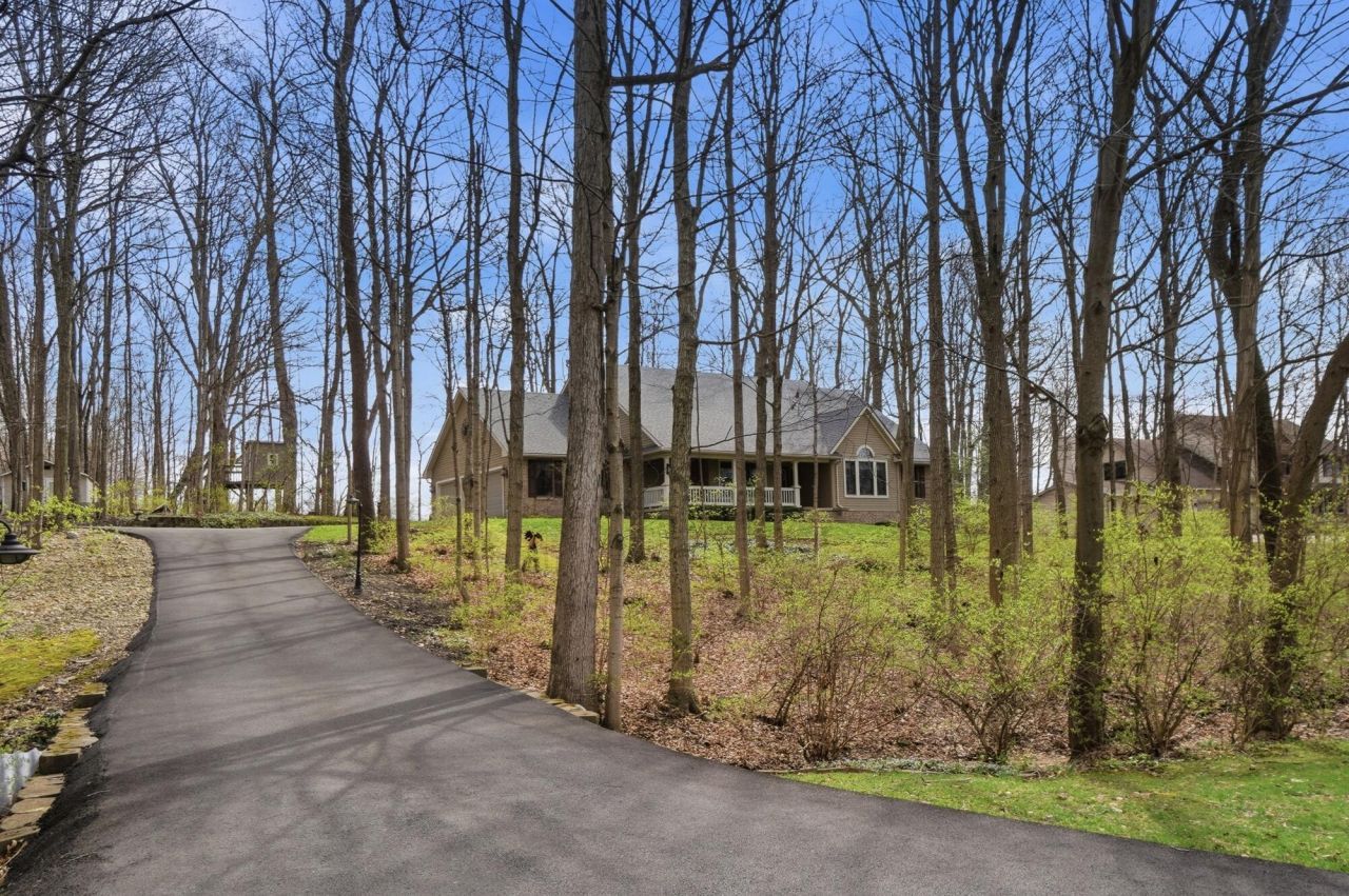 Welcome to this stunning custom-built home offering exceptional craftsmanship, thoughtful design, and modern updates throughout! Situated on approximately 1 acre of scenic, private land, this 3-bedroom, 2-bath property blends comfort, style, and tranquility. Inside, enjoy a spacious formal dining room set apart for hosting and a large living room with an updated gas fireplace and striking stone surround. The space flows seamlessly into the kitchen and breakfast area--perfect for everyday living and entertaining.The kitchen features rich hickory cabinetry, granite countertops, and ample space to gather. Step from the eat-in area onto the back deck, ideal for relaxing or entertaining. A utility room adds convenience. All bedrooms are generously sized with great closet space. The primary suite offers a private retreat with an updated en-suite bath, sleek stand-up shower, and well-lit makeup vanity. Both bathrooms were updated in 2023, and the suite includes its own access to porch. The finished basement provides approximately 675 sq ft of additional living space (not included in total square footage), featuring a second gas fireplace--perfect for a rec room, media space, or extra living area plus storage. Enjoy the outdoors from the large front porch with sitting area or unwind on either deck. A 3-car attached garage offers plenty of space.Updates include: new roof (2025), Leaf Filter gutters, new carpet (excluding dining), on-demand water heater (2022), updated baths (2023), and new driveway.