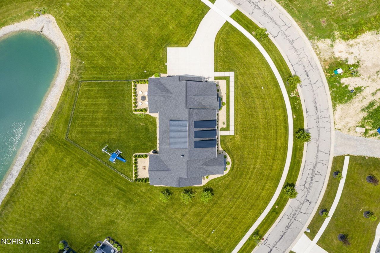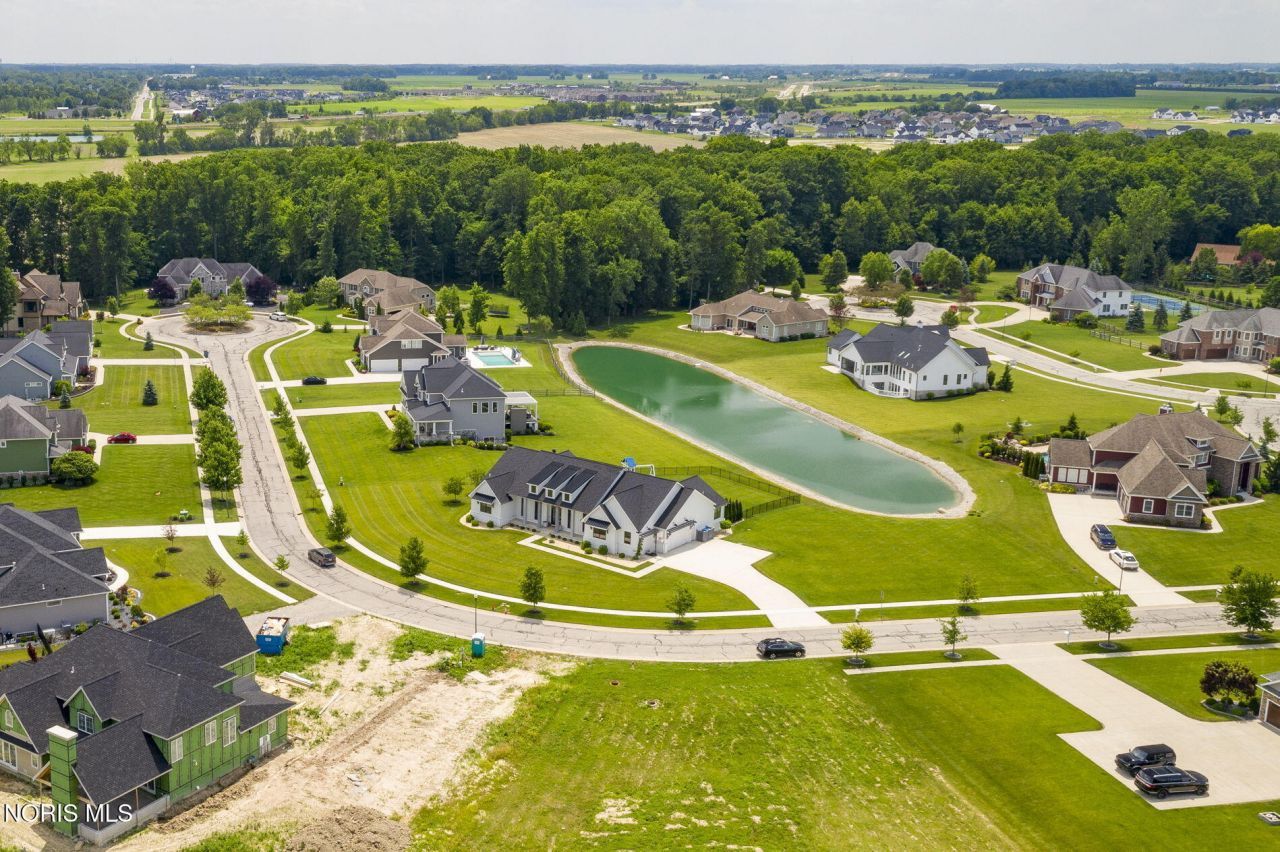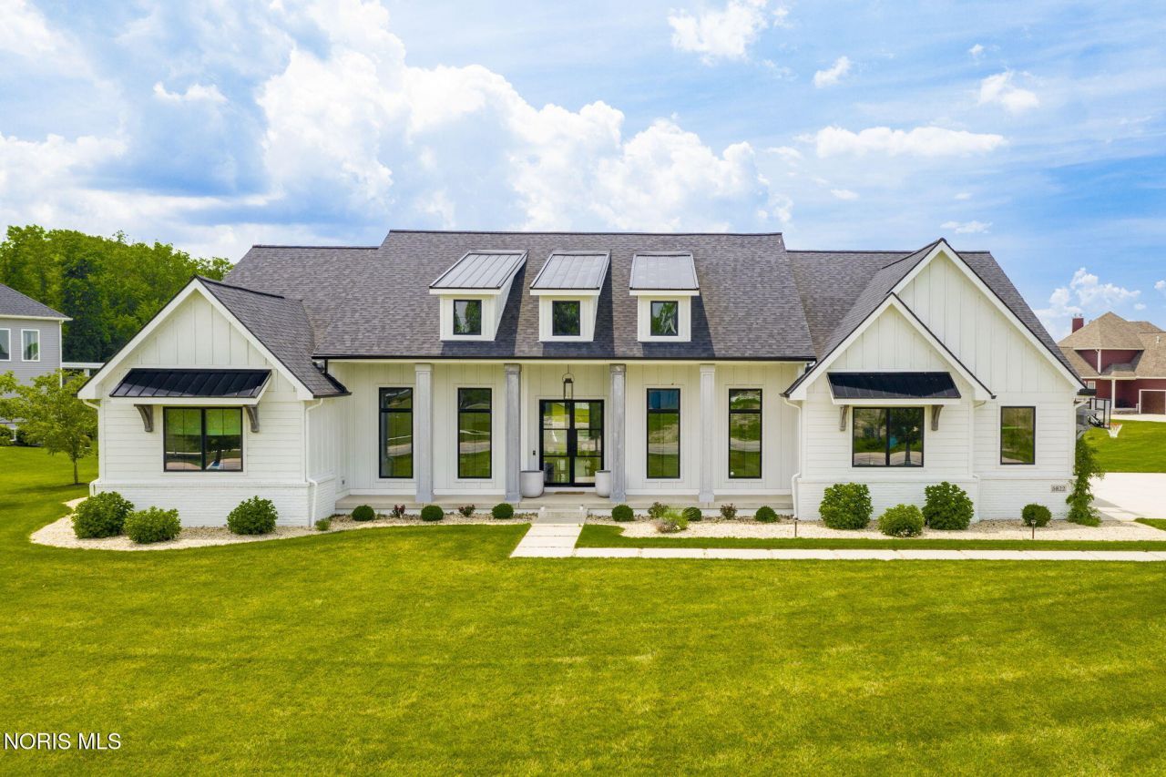 Welcome to this custom-built luxury modern farmhouse in Monclova's desirable Hamptons community, offering the quality and design of new construction without the wait or premium price. Built in 2020 and impeccably maintained, this 5,800+ square-foot ranch sits on a private one-acre pond-front lot in a quiet cul-de-sac. The home's open-concept layout is filled with natural light and anchored by dramatic 18-foot ceilings in the kitchen and great room, with 9-foot ceilings throughout the rest of the home. The great room is anchored by a natural gas starter fireplace, making the room feel cozy. The chef's kitchen is equipped with Bertazzoni appliances, premium finishes, and designer lighting, flowing seamlessly into the main living space-perfect for entertaining and everyday living. Every bedroom features its own private full bathroom, creating comfort and privacy for family and guests. The expansive finished lower level provides incredible additional living space with a second kitchen, bedroom, full bath, and fitness/rec room, ideal for entertaining, hosting guests, or multigenerational living. Step outside to a fenced backyard overlooking the pond, an ideal setting for summer evenings and sunset dinners. Outdoor features include gas lanterns and a gas hookup for grilling, creating a warm and inviting space to gather year-round. (Sqft includes lower level space)